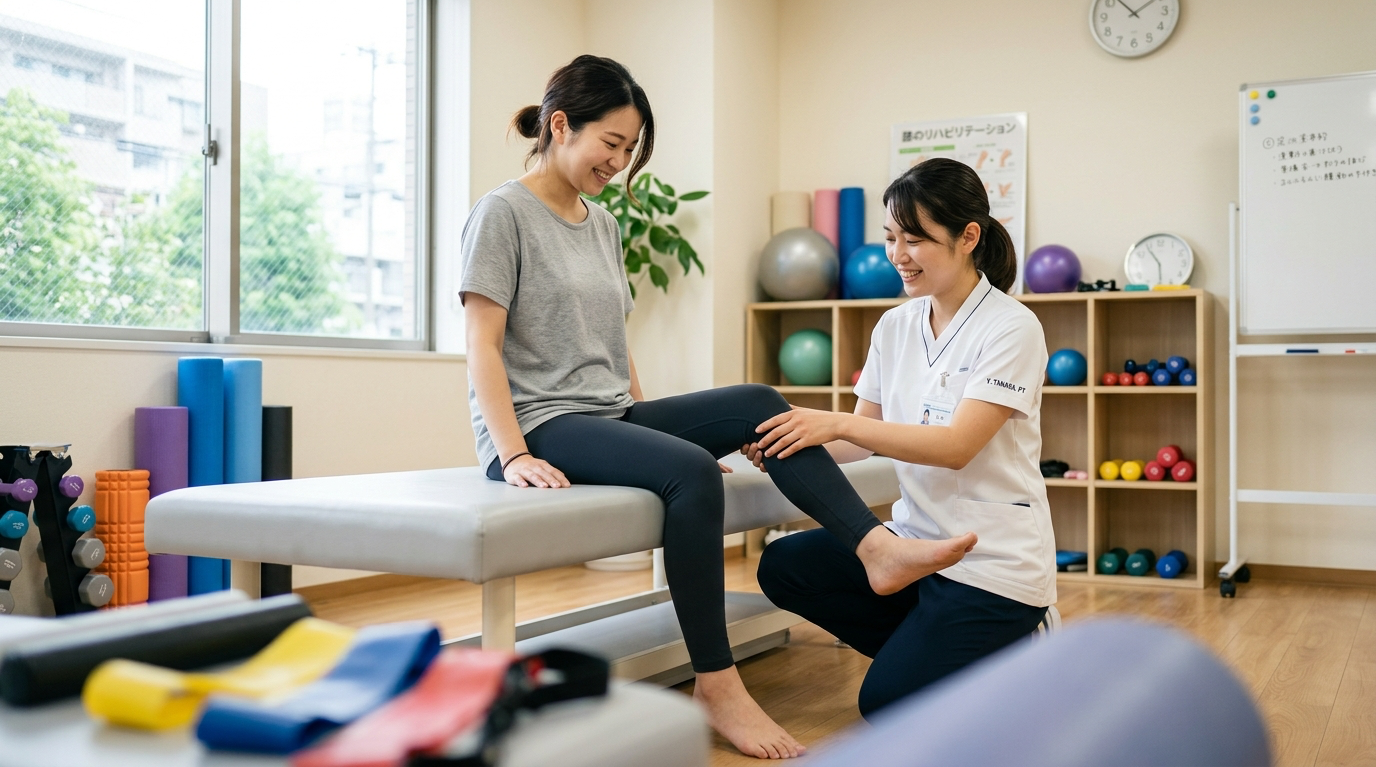 大腿四頭筋のストレッチ・骨盤周りの筋力強化・姿勢改善指導を組み合わせます。妊娠中に変化した姿勢を正しく戻すアプローチが、膝蓋骨上部の痛みには特に有効です。妊娠に詳しい専門の理学療法士の対応が必須です。