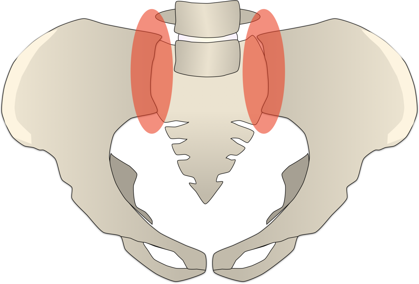 図の赤い部分を仙腸関節と言います。腰の後ろにある関節で本来はほとんど動きません。かなり硬い靭帯で固定されているためです。これが妊娠に伴い緩むことで動きがでてきますが、この仙腸関節が動き過ぎると痛みが出てきてしまいます。