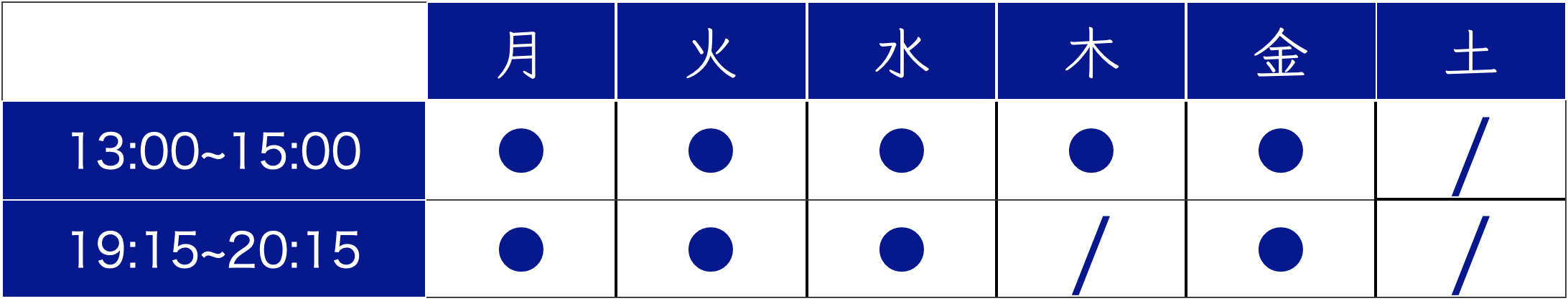 | 15:30~18:30 | ⚫︎ | ⚫︎ | ⚫︎ | × | ⚫︎ | × |
