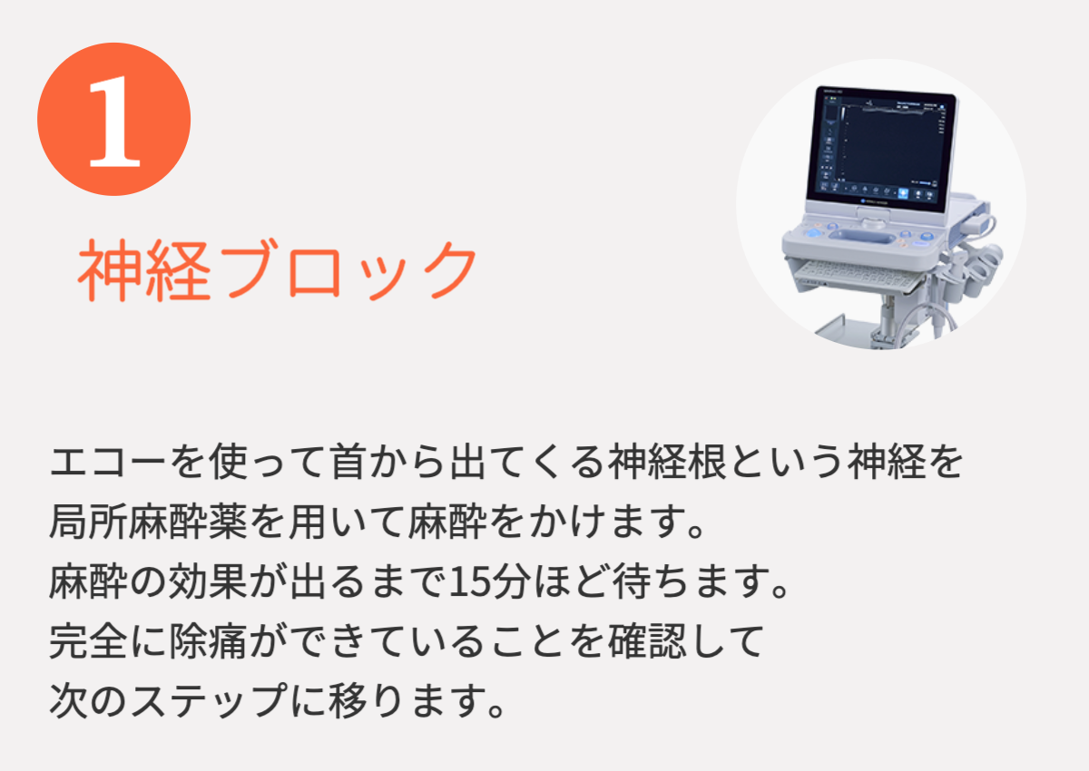 上記のマニピュレーションと同じく難治性の疼痛の治療として当院では神経ブロックもおこなっております。エコーを使うことで精度の高い神経ブロックをおこなっております。詳しくは詳細ページをご参照ください。