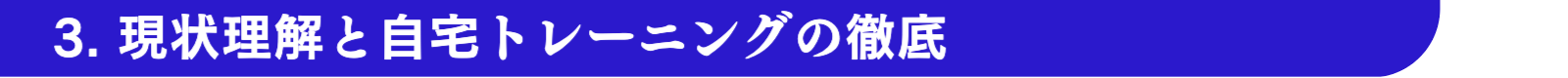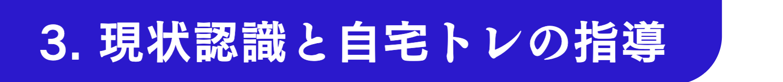 トレーニングを通して現状を認識して正確に今の自分の状態を把握してもらいます。認識の誤差がある場合は徹底して修正を行います。その上で自宅で行うトレーニングを指導して繰り返し行ってもらいます。これを行うことでトレーニングの能率が格段に上昇します。