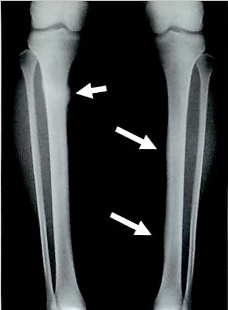 初期は骨がストレスに反応して骨吸収像を呈し